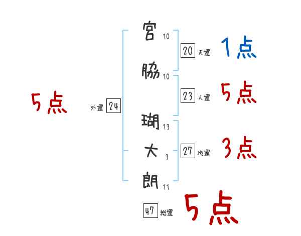 外運![]() | 宮脇瑚大朗さんの外運は24画の5つ星!家庭運が良く順調な人生。金運にも恵まれる。 生活面を象徴する運勢です。外部から受ける影響力を表し、結婚運、家庭運や職場、環境への順応性を表します。 |