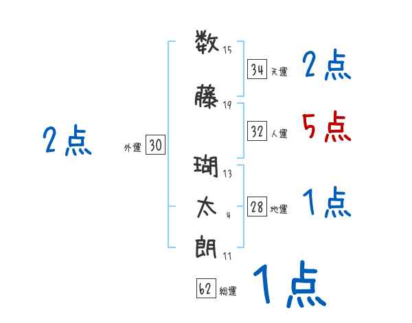 人運![]() | 数藤瑚太朗さんの人運は32画の5つ星!柔軟性があり成功する。チャンスが多く金運が良い。 性格や才能などを表す2番目に重要な運勢です。人間関係や協調性、社会的な成功に影響します。主に20歳から50歳ぐらいまでの中年期の運勢を表します。 |