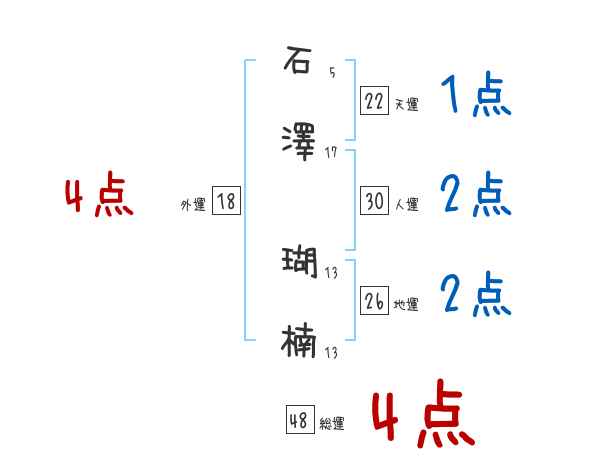 外運![]() | 石澤瑚楠さんの外運は18画の4つ星!情熱的で剛気。忍耐力があり信頼される。 生活面を象徴する運勢です。外部から受ける影響力を表し、結婚運、家庭運や職場、環境への順応性を表します。 |