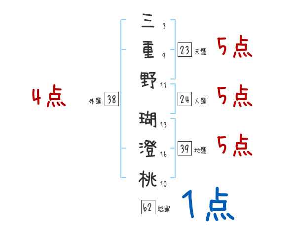 天運![]() | 三重野瑚澄桃さんの天運は23画の5つ星!想像力に優れ活力がある。一代で成功し名誉を手に入れる。 家系が持つ宿命的な運勢を表します。祖先から受け継いだ苗字ですので自分の力が及びません。家柄を象徴します。 |