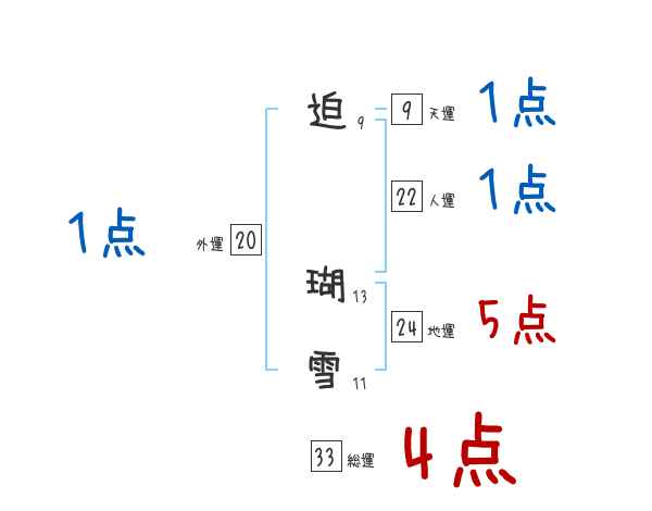 天運![]() | 迫瑚雪さんの天運は9画の1つ星!消極的で才能を発揮することが苦手なことも。周りの意見に耳を傾けましょう。 家系が持つ宿命的な運勢を表します。祖先から受け継いだ苗字ですので自分の力が及びません。家柄を象徴します。 |