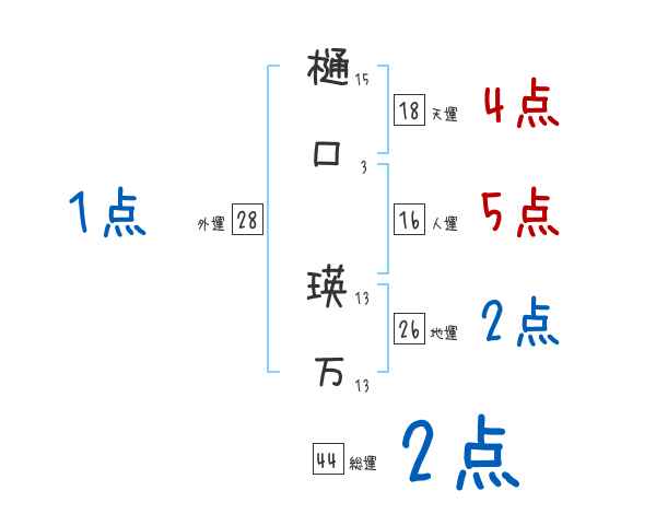 総運![]() | 樋口瑛万さんの総運は44画の2つ星!誠実で慎重な性格。物事を考えすぎないように注意しましょう。 あなたの人生を表す1番重要な運勢です。生涯を通じて影響する総合運となり、主に50歳以降の晩年期に影響を及ぼします。 |