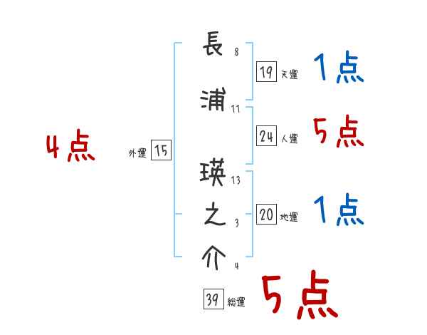 総運![]() | 長浦瑛之介さんの総運は39画の5つ星!社交性に優れ人望が厚い。人の上に立ち成功する。 あなたの人生を表す1番重要な運勢です。生涯を通じて影響する総合運となり、主に50歳以降の晩年期に影響を及ぼします。 |
