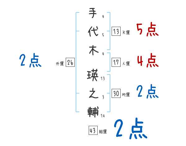 外運![]() | 手代木瑛之輔さんの外運は26画の2つ星!波瀾万丈かも。信頼できる人を大事にしましょう。 生活面を象徴する運勢です。外部から受ける影響力を表し、結婚運、家庭運や職場、環境への順応性を表します。 |