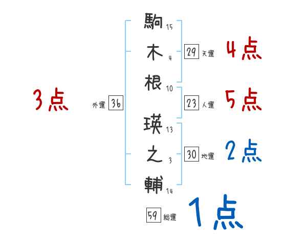 天運![]() | 駒木根瑛之輔さんの天運は29画の4つ星!完全主義で才能がある。厳格な心の持ち主。 家系が持つ宿命的な運勢を表します。祖先から受け継いだ苗字ですので自分の力が及びません。家柄を象徴します。 |