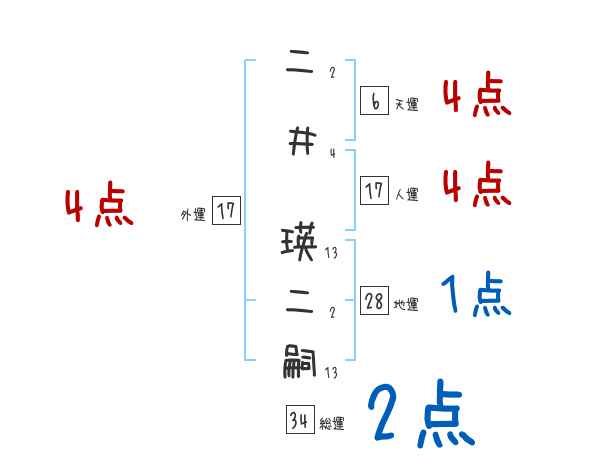 外運![]() | 二井瑛二嗣さんの外運は17画の4つ星!積極的な行動力。地位を気づき財産を手に入れる。純粋な心と直感力。 生活面を象徴する運勢です。外部から受ける影響力を表し、結婚運、家庭運や職場、環境への順応性を表します。 |