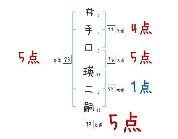 人運![]() | 井手口瑛二嗣さんの人運は16画の5つ星!人望が厚く大きく発展する。逆転成功が見える。 性格や才能などを表す2番目に重要な運勢です。人間関係や協調性、社会的な成功に影響します。主に20歳から50歳ぐらいまでの中年期の運勢を表します。 |