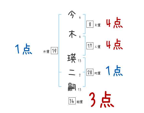 外運![]() | 今木瑛二嗣さんの外運は19画の1つ星!優れた才能を持ちますが、協調性が足りないことも。周りの人と協力する事を意識しましょう。 生活面を象徴する運勢です。外部から受ける影響力を表し、結婚運、家庭運や職場、環境への順応性を表します。 |