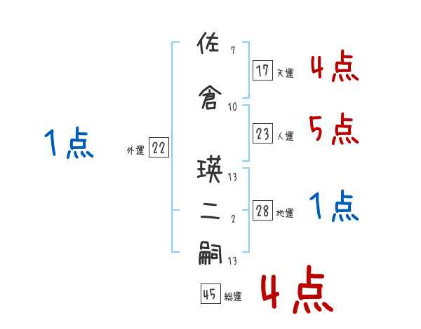 人運![]() | 佐倉瑛二嗣さんの人運は23画の5つ星!想像力に優れ活力がある。一代で成功し名誉を手に入れる。 性格や才能などを表す2番目に重要な運勢です。人間関係や協調性、社会的な成功に影響します。主に20歳から50歳ぐらいまでの中年期の運勢を表します。 |