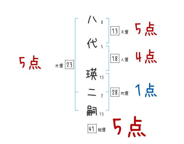 外運![]() | 八代瑛二嗣さんの外運は23画の5つ星!想像力に優れ活力がある。一代で成功し名誉を手に入れる。 生活面を象徴する運勢です。外部から受ける影響力を表し、結婚運、家庭運や職場、環境への順応性を表します。 |