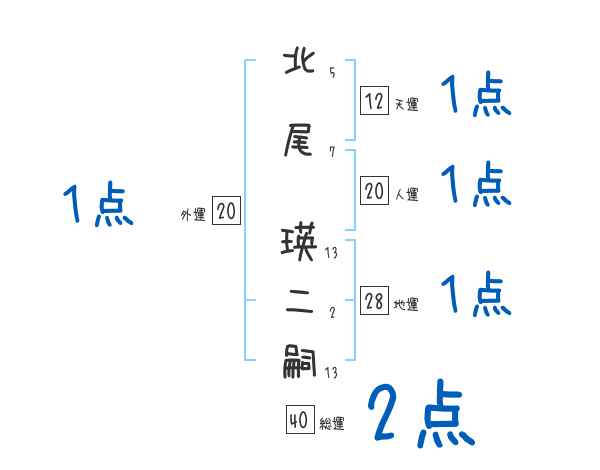 天運![]() | 北尾瑛二嗣さんの天運は12画の1つ星!簡単な失敗で諦めてしまいやすいかも。着実に行動すると良いでしょう。 家系が持つ宿命的な運勢を表します。祖先から受け継いだ苗字ですので自分の力が及びません。家柄を象徴します。 |