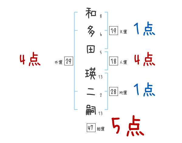 総運![]() | 和多田瑛二嗣さんの総運は47画の5つ星!実力が開花し発展する円満な人生。財に恵まれる。 あなたの人生を表す1番重要な運勢です。生涯を通じて影響する総合運となり、主に50歳以降の晩年期に影響を及ぼします。 |