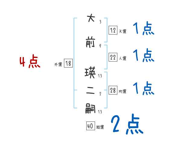 天運![]() | 大前瑛二嗣さんの天運は12画の1つ星!簡単な失敗で諦めてしまいやすいかも。着実に行動すると良いでしょう。 家系が持つ宿命的な運勢を表します。祖先から受け継いだ苗字ですので自分の力が及びません。家柄を象徴します。 |