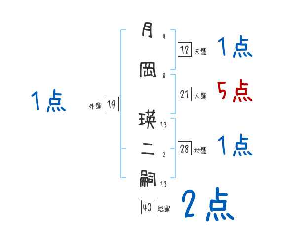 人運![]() | 月岡瑛二嗣さんの人運は21画の5つ星!統率力がある。独立し成功する。名誉を手に入れる。 性格や才能などを表す2番目に重要な運勢です。人間関係や協調性、社会的な成功に影響します。主に20歳から50歳ぐらいまでの中年期の運勢を表します。 |