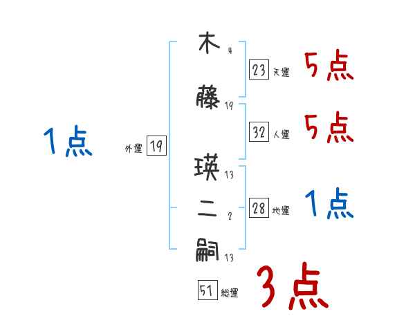 人運![]() | 木藤瑛二嗣さんの人運は32画の5つ星!柔軟性があり成功する。チャンスが多く金運が良い。 性格や才能などを表す2番目に重要な運勢です。人間関係や協調性、社会的な成功に影響します。主に20歳から50歳ぐらいまでの中年期の運勢を表します。 |