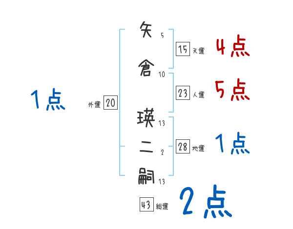 総運![]() | 矢倉瑛二嗣さんの総運は43画の2つ星!頑固な性格で独立心が強いかも。やや非現実的で浪費に注意しましょう。 あなたの人生を表す1番重要な運勢です。生涯を通じて影響する総合運となり、主に50歳以降の晩年期に影響を及ぼします。 |