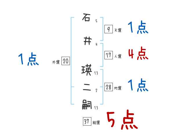 天運![]() | 石井瑛二嗣さんの天運は9画の1つ星!消極的で才能を発揮することが苦手なことも。周りの意見に耳を傾けましょう。 家系が持つ宿命的な運勢を表します。祖先から受け継いだ苗字ですので自分の力が及びません。家柄を象徴します。 |