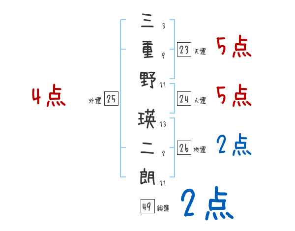 天運![]() | 三重野瑛二朗さんの天運は23画の5つ星!想像力に優れ活力がある。一代で成功し名誉を手に入れる。 家系が持つ宿命的な運勢を表します。祖先から受け継いだ苗字ですので自分の力が及びません。家柄を象徴します。 |