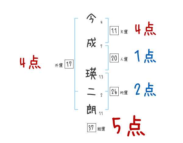 外運![]() | 今成瑛二朗さんの外運は17画の4つ星!積極的な行動力。地位を気づき財産を手に入れる。純粋な心と直感力。 生活面を象徴する運勢です。外部から受ける影響力を表し、結婚運、家庭運や職場、環境への順応性を表します。 |