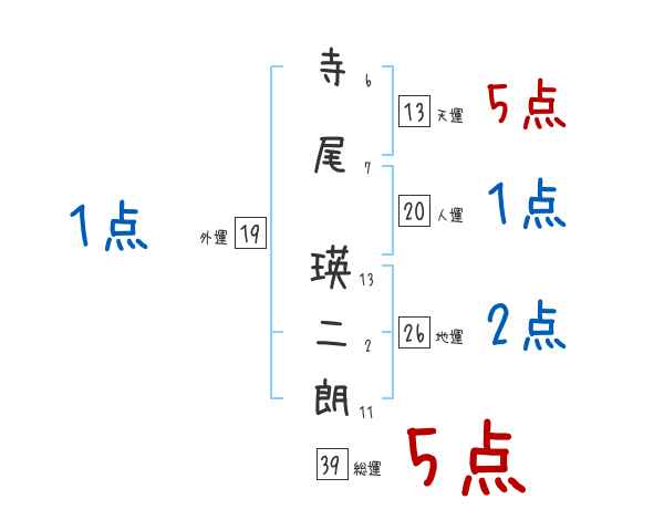 総運![]() | 寺尾瑛二朗さんの総運は39画の5つ星!社交性に優れ人望が厚い。人の上に立ち成功する。 あなたの人生を表す1番重要な運勢です。生涯を通じて影響する総合運となり、主に50歳以降の晩年期に影響を及ぼします。 |