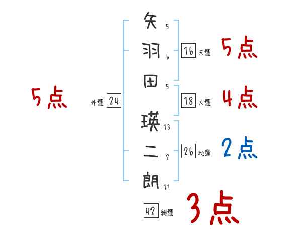 外運![]() | 矢羽田瑛二朗さんの外運は24画の5つ星!家庭運が良く順調な人生。金運にも恵まれる。 生活面を象徴する運勢です。外部から受ける影響力を表し、結婚運、家庭運や職場、環境への順応性を表します。 |