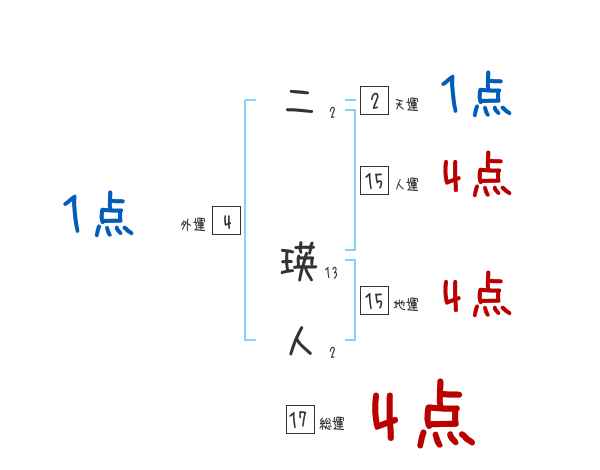 天運![]() | 二瑛人さんの天運は2画の1つ星!優しいですが積極性や意思の強さに欠ける傾向があります。家庭環境の乱れに注意しましょう。 家系が持つ宿命的な運勢を表します。祖先から受け継いだ苗字ですので自分の力が及びません。家柄を象徴します。 |