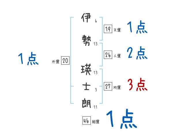 地運![]() | 伊勢瑛士朗さんの地運は27画の3つ星!頭脳明晰だが強情で摩擦が多い傾向。孤立に注意。 個性を表す基礎的な運勢です。性格形成や対人関係、行動力など家庭環境に影響されます。主に誕生してから20歳くらいまでの若年期の運勢を表します。 |