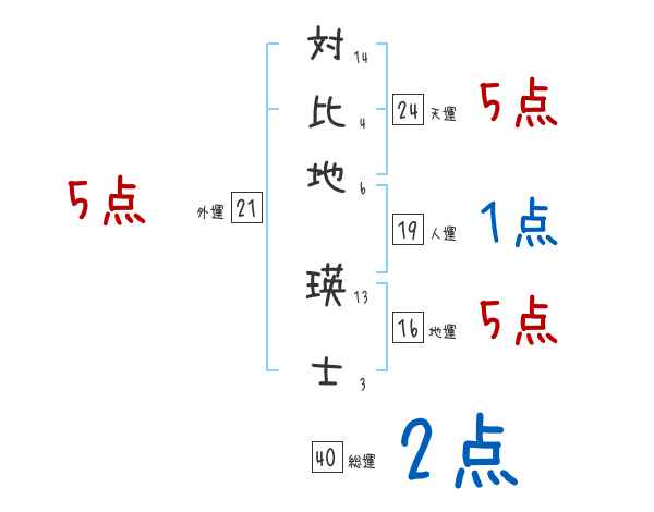 外運![]() | 対比地瑛士さんの外運は21画の5つ星!統率力がある。独立し成功する。名誉を手に入れる。 生活面を象徴する運勢です。外部から受ける影響力を表し、結婚運、家庭運や職場、環境への順応性を表します。 |