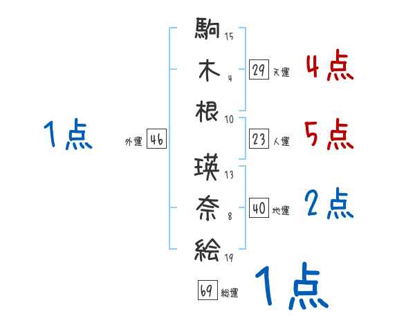 人運![]() | 駒木根瑛奈絵さんの人運は23画の5つ星!想像力に優れ活力がある。一代で成功し名誉を手に入れる。 性格や才能などを表す2番目に重要な運勢です。人間関係や協調性、社会的な成功に影響します。主に20歳から50歳ぐらいまでの中年期の運勢を表します。 |
