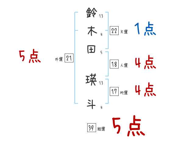 総運![]() | 鈴木田瑛斗さんの総運は39画の5つ星!社交性に優れ人望が厚い。人の上に立ち成功する。 あなたの人生を表す1番重要な運勢です。生涯を通じて影響する総合運となり、主に50歳以降の晩年期に影響を及ぼします。 |