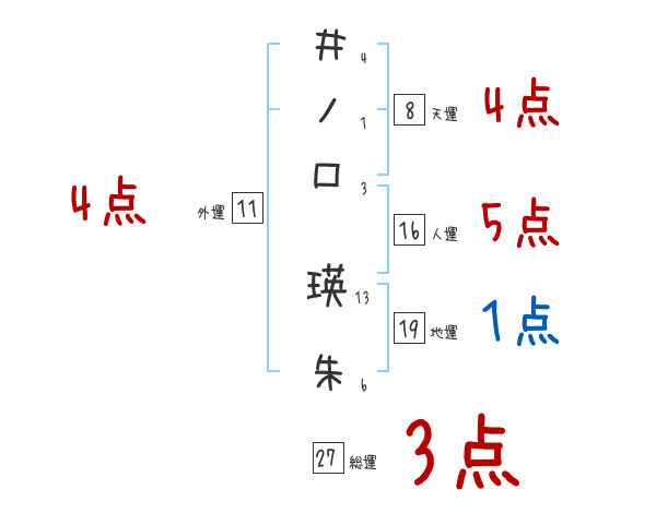 人運![]() | 井ノ口瑛朱さんの人運は16画の5つ星!人望が厚く大きく発展する。逆転成功が見える。 性格や才能などを表す2番目に重要な運勢です。人間関係や協調性、社会的な成功に影響します。主に20歳から50歳ぐらいまでの中年期の運勢を表します。 |