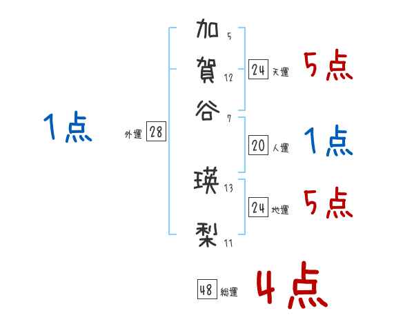 外運![]() | 加賀谷瑛梨さんの外運は28画の1つ星!家庭環境に注意。スポーツで活躍できる能力があるかも。 生活面を象徴する運勢です。外部から受ける影響力を表し、結婚運、家庭運や職場、環境への順応性を表します。 |