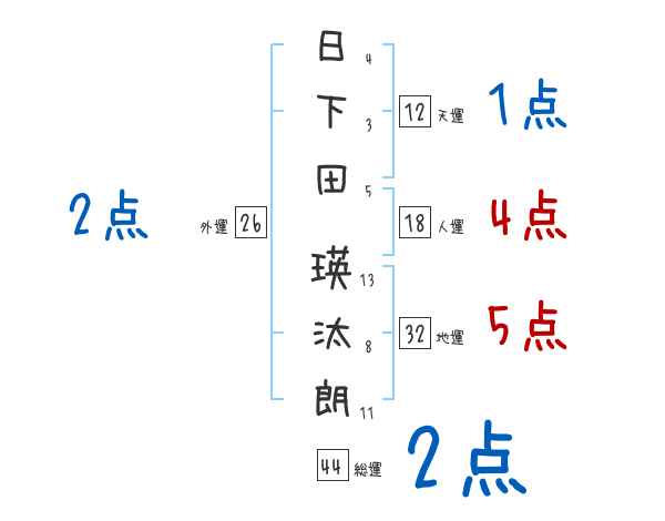 総運![]() | 日下田瑛汰朗さんの総運は44画の2つ星!誠実で慎重な性格。物事を考えすぎないように注意しましょう。 あなたの人生を表す1番重要な運勢です。生涯を通じて影響する総合運となり、主に50歳以降の晩年期に影響を及ぼします。 |