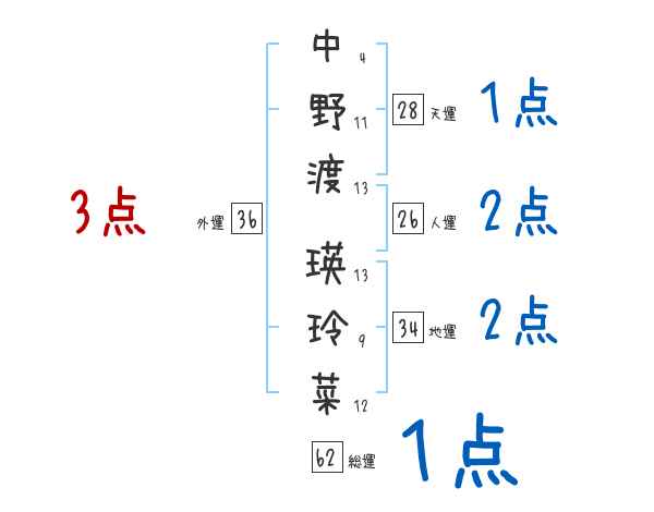 天運![]() | 中野渡瑛玲菜さんの天運は28画の1つ星!家庭環境に注意。スポーツで活躍できる能力があるかも。 家系が持つ宿命的な運勢を表します。祖先から受け継いだ苗字ですので自分の力が及びません。家柄を象徴します。 |