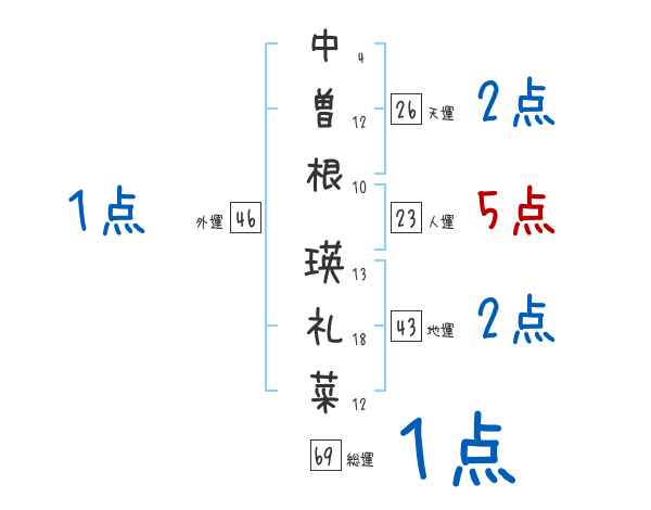 人運![]() | 中曽根瑛礼菜さんの人運は23画の5つ星!想像力に優れ活力がある。一代で成功し名誉を手に入れる。 性格や才能などを表す2番目に重要な運勢です。人間関係や協調性、社会的な成功に影響します。主に20歳から50歳ぐらいまでの中年期の運勢を表します。 |