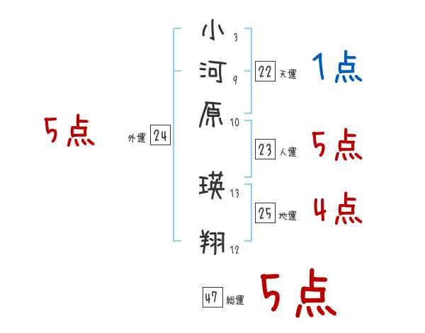 天運![]() | 小河原瑛翔さんの天運は22画の1つ星!努力することが苦手ないっぽう手先が器用。芸術性にも優れる。 家系が持つ宿命的な運勢を表します。祖先から受け継いだ苗字ですので自分の力が及びません。家柄を象徴します。 |