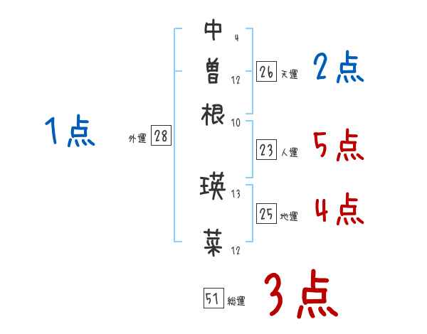 外運![]() | 中曽根瑛菜さんの外運は28画の1つ星!家庭環境に注意。スポーツで活躍できる能力があるかも。 生活面を象徴する運勢です。外部から受ける影響力を表し、結婚運、家庭運や職場、環境への順応性を表します。 |