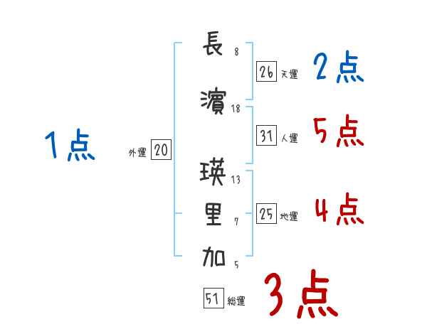 天運![]() | 長濵瑛里加さんの天運は26画の2つ星!波瀾万丈かも。信頼できる人を大事にしましょう。 家系が持つ宿命的な運勢を表します。祖先から受け継いだ苗字ですので自分の力が及びません。家柄を象徴します。 |