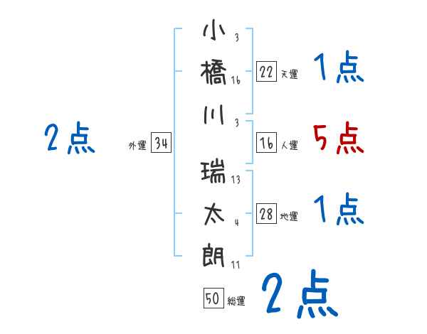 人運![]() | 小橋川瑞太朗さんの人運は16画の5つ星!人望が厚く大きく発展する。逆転成功が見える。 性格や才能などを表す2番目に重要な運勢です。人間関係や協調性、社会的な成功に影響します。主に20歳から50歳ぐらいまでの中年期の運勢を表します。 |