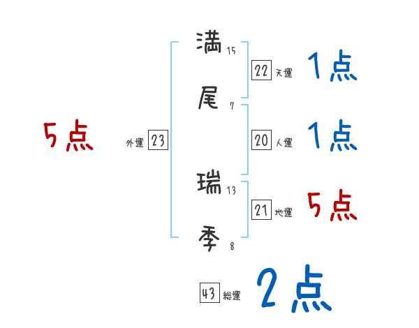 天運![]() | 満尾瑞季さんの天運は22画の1つ星!努力することが苦手ないっぽう手先が器用。芸術性にも優れる。 家系が持つ宿命的な運勢を表します。祖先から受け継いだ苗字ですので自分の力が及びません。家柄を象徴します。 |