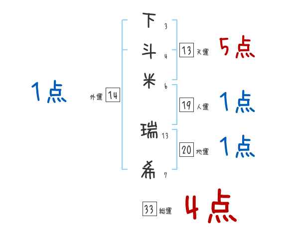 外運![]() | 下斗米瑞希さんの外運は14画の1つ星!人に対して優しいがストレスを溜め込みがち。人間関係のトラブルを避けるよう気をつけましょう。 生活面を象徴する運勢です。外部から受ける影響力を表し、結婚運、家庭運や職場、環境への順応性を表します。 |