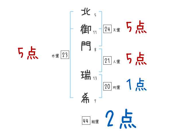 天運![]() | 北御門瑞希さんの天運は24画の5つ星!家庭運が良く順調な人生。金運にも恵まれる。 家系が持つ宿命的な運勢を表します。祖先から受け継いだ苗字ですので自分の力が及びません。家柄を象徴します。 |