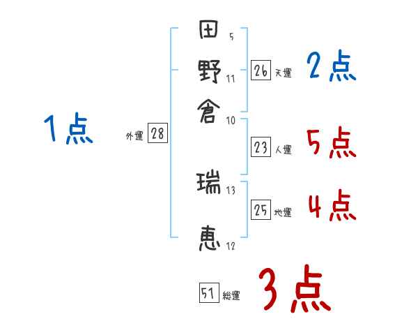 総運![]() | 田野倉瑞恵さんの総運は51画の3つ星!変化が激しく、危険に注意。堅実な性格。 あなたの人生を表す1番重要な運勢です。生涯を通じて影響する総合運となり、主に50歳以降の晩年期に影響を及ぼします。 |