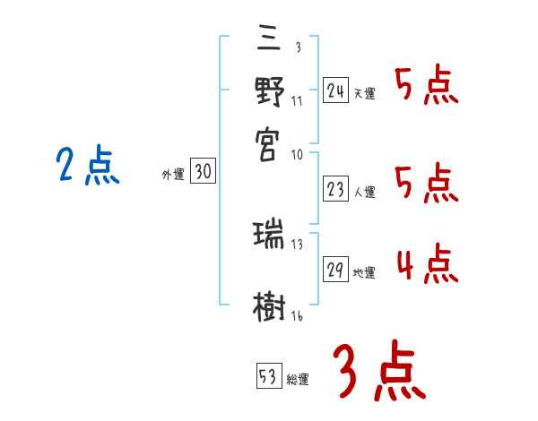 天運![]() | 三野宮瑞樹さんの天運は24画の5つ星!家庭運が良く順調な人生。金運にも恵まれる。 家系が持つ宿命的な運勢を表します。祖先から受け継いだ苗字ですので自分の力が及びません。家柄を象徴します。 |