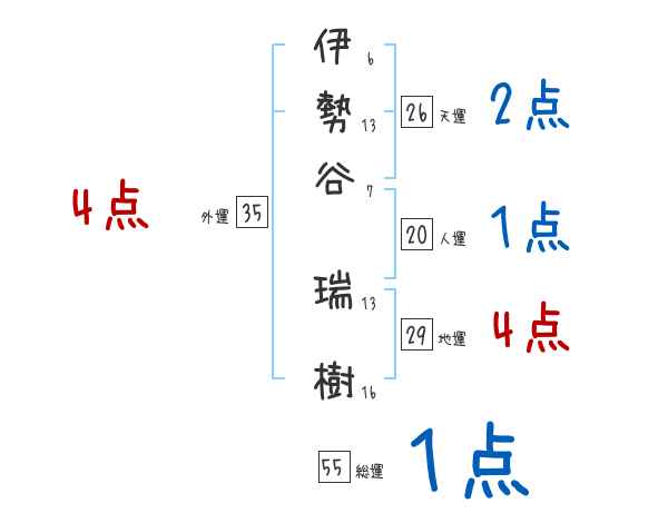 天運![]() | 伊勢谷瑞樹さんの天運は26画の2つ星!波瀾万丈かも。信頼できる人を大事にしましょう。 家系が持つ宿命的な運勢を表します。祖先から受け継いだ苗字ですので自分の力が及びません。家柄を象徴します。 |