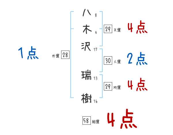 天運![]() | 八木沢瑞樹さんの天運は29画の4つ星!完全主義で才能がある。厳格な心の持ち主。 家系が持つ宿命的な運勢を表します。祖先から受け継いだ苗字ですので自分の力が及びません。家柄を象徴します。 |