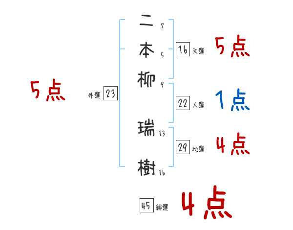天運![]() | 二本柳瑞樹さんの天運は16画の5つ星!人望が厚く大きく発展する。逆転成功が見える。 家系が持つ宿命的な運勢を表します。祖先から受け継いだ苗字ですので自分の力が及びません。家柄を象徴します。 |