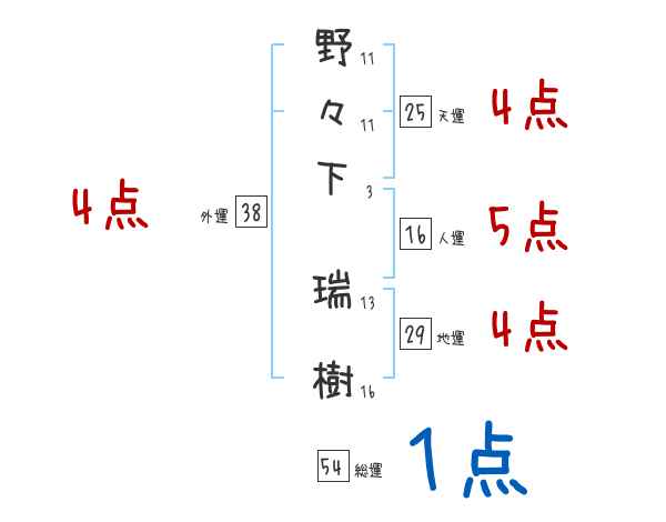 人運![]() | 野々下瑞樹さんの人運は16画の5つ星!人望が厚く大きく発展する。逆転成功が見える。 性格や才能などを表す2番目に重要な運勢です。人間関係や協調性、社会的な成功に影響します。主に20歳から50歳ぐらいまでの中年期の運勢を表します。 |