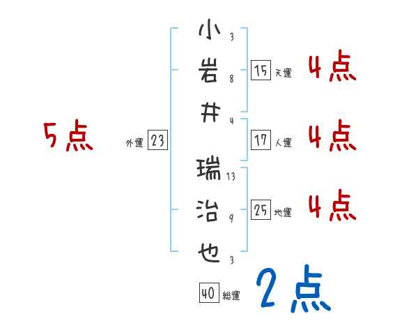 外運![]() | 小岩井瑞治也さんの外運は23画の5つ星!想像力に優れ活力がある。一代で成功し名誉を手に入れる。 生活面を象徴する運勢です。外部から受ける影響力を表し、結婚運、家庭運や職場、環境への順応性を表します。 |