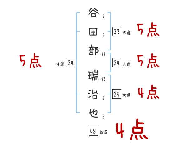 天運![]() | 谷田部瑞治也さんの天運は23画の5つ星!想像力に優れ活力がある。一代で成功し名誉を手に入れる。 家系が持つ宿命的な運勢を表します。祖先から受け継いだ苗字ですので自分の力が及びません。家柄を象徴します。 |